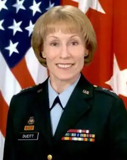Dueitt moved to the Washington, D.C. area in 1977 to work for the United States Department of Health, Education, and Welfare. Soon after, at a dinner, staff members of U.S. Senate Armed Services Committee chair John C. Stennis convinced her to commission as a reserve military officer.[2] By 1997, Dueitt was a colonel in the Army's Adjutant General's Corps and deputy chief of public affairs at Army headquarters in The Pentagon. In June of that year, she was promoted to brigadier general, becoming the first female general officer in the Army Reserve not from the Nurse Corps.[1][3]