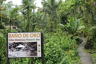 The Baño de Oro Historic Site (Spanish for golden bath) is a historic recreation center and swimming pool located in the Baño de Oro area of El Yunque National Forest in Río Grande, Puerto Rico. The site of Baño de Oro gets its name from the Baño de Oro Creek,[1] which itself is named after the former Spanish gold panning sites in the area.[2] The wider Baño de Oro Natural Area where the historic site is found was named a National Natural Landmark in 1980 and it is the only contiguous area in Puerto Rico that contains a subtropical wet forest, a rainforest, a dwarf forest, and a Pterocarpus forest.[3]