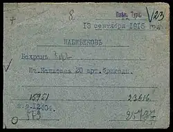 In 1911, he was poruchik, serving in 6th battery.[3] In 1912, he was assistant-chief of the 2nd Caucasian artillery practice polygon.[4] On 31 August 1912 Nabibekov was promoted to the rank of shtabs-kapitan. In the First World War he fought in the 20th artillery brigade at the Caucasian Front. He was decorated with the Order of Saint Stanislaus and the Order of St. Anna.