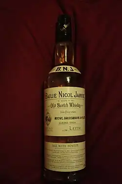 The Bailie Nicol Jarvie was first blended by Nicol Anderson & Co, a Glasgow-based whisky company that was acquired by the whisky company Macdonald & Muir of Leith in 1921. The whisky was named after a character in Sir Walter Scott's renowned novel Rob Roy – a bailie (magistrate) who tackled a sword-wielding Highland clansman in an inn at Clachan of Aberfoyle,[1] setting fire to his kilt with a red-hot poker.[2] The blend was particularly popular in the early 20th century.