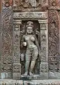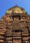 Baitaḷa Deuḷa Temple’s striking feature is the shape of its sanctuary tower. The semi-cylindrical shape of its roof is a leading example of Khakhara order of temples— which bears an affinity to the Dravidian Gopuram of the South Indian temples. Its gabled towers with a row of Shikharas reveals unmistakable signs of southern intrusion.[1] The plan of the deuḷa is oblong and the jagamohana is a rectangular structure, but embedded in each angle is a small subsidiary shrine. Baitala deuḷa boasts of some figures, although executed in relief, are however characterized by delicacy of features and perfect equipoise.[2][3]