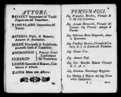 The first production included Francesco Borosini in the title role, Antonio Bernacchi (Tamerlano), Marina Benta Bulgarelli (Asteria), Faustina Bordoni (Irene), Diana Vico (Andronico), Antonio Piasi (Clearco), Battista Roberti (Leone) and Girolamo Bartoluzzi Regiano (Zaida).[1][2]