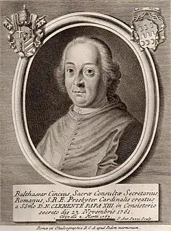 1. ^ a b c d Miranda, Salvador. "CENCI, iuniore, Baldassare (1710-1763)". The Cardinals of the Holy Roman Church. Florida International University. OCLC 53276621. Retrieved December 29, 2019.