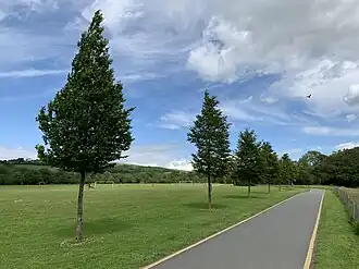 The park contains soccer pitches, a rugby pitch, walkways, a skateboard facility built at the cost of 170,000 euro,[1] and free-to-use outdoor fitness equipment - the latter installed on the park's western end in November 2011. As a result of a 2012 development plan, which outlined the future of the Regional Park by the Recreation & Amenity section of the local authority,[8] planning was approved for multi-use games areas and a children's playground. By 2019, the total of 1.4 million euro was spent on facilities.[9] An 80-plot allotment scheme was also identified within the development plan,[8] and was opened in November 2013 at the Innishmore entrance to the Regional Park.