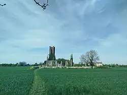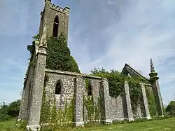 A Church of Ireland structure built in 1831[7] in a Gothic Revival style with £900 from the Board of First Fruits.[8][9] It has a tall tower and each corner has sharp finials rising from four of the twelve buttresses. It ceased to be used in 1959 and was unroofed in 1985.[5] Entrances and windows have been bricked up.[2]