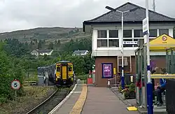 On weekdays and Saturdays, four trains a day call here in either direction. Travelling eastbound, three of them are through trains to Glasgow Queen Street, whilst the other terminates at Fort William and connects with the Caledonian Sleeper service to London Euston.[9][10]