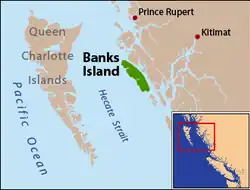Banks Island is an island on the coast of the Canadian province of British Columbia. It is located south of Prince Rupert, on Hecate Strait, east of and opposite Haida Gwaii. To its east is Pitt Island and McCauley Island, both across Principe Channel. To its west is Bonilla Island. To its south lies the archipelago of the Estevan Group, beyond which is Caamaño Sound.
