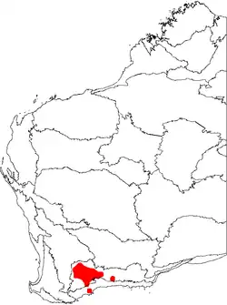 Distribution of B. xylothemelia, shown on a map of Western Australia's biogeographic regions.[6]