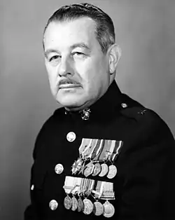 Lieutenant Colonel Holcomb returned to Pacific in the early 1945, when he was assigned as a radio intelligence and translation officer on the Task Force 58 staff under Admiral Raymond A. Spruance. He subsequently participated in the Battle of Iwo Jima and Battle of Okinawa with that command and was decorated with the Bronze Star Medal with Combat "V" for his distinguished work during the whole duration of the war, Holcomb was also decorated with the Legion of Merit with Combat "V".[3][1][2]
