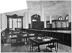 The wood decoration within the interior is teak, with a Baroque decorative style. When it was first built, the centre of the first floor was the bank's hall, a large space supported by six Ionic columns. The six columns are divided into two rows, dividing the ceiling into three sections. The beams on the left and right sections of the ceiling form a grid-shaped ceiling with exquisite moldings and dense dentil decoration. The middle section of the ceiling is covered with a rectangular arched glass ceiling. The glass ceiling is supported by fine arch ribs and is partially decorated. Low teak counters are arranged along the columns in the hall. The six columns have rectangular teak plinths at the bottom, which are connected with the counters. The walls around the hall are covered with Ionic pilasters.