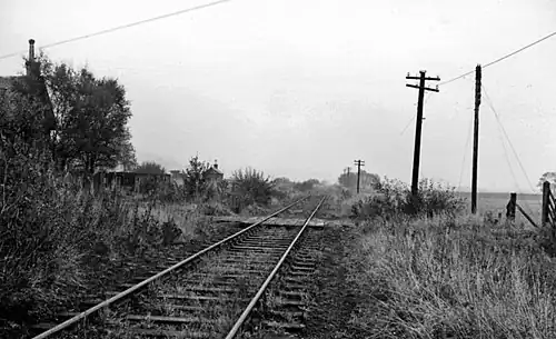 The single platform and station building with its ticket office, waiting room, canopy, etc. stood on the northern side of this single track line with sidings and cross over sidings on the northern side serving the waste disposal areas on either side of Station Road, etc. A weighing machine house and a stationmaster's house were present. A signal box is shown at the eastern end of the station.[6][7] The main station building stood at the eastern end of the platform. The 1957 OS map shows a passing loop just to the east of the old station on the single track line with all the trackwork otherwise lifted from the spoil bings, etc.[8]