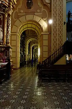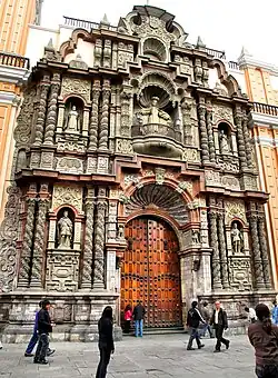 The Basilica and Priory of Nuestra Señora de la Merced is a Roman Catholic church located in Lima, Peru. It was designed in the Baroque style known as Churrigueresque. The church was built under the supervision of Friar Miguel de Orenes in 1535. The Blessed Virgin Mary of Mercy, the patroness of the Peruvian Armed Forces, is venerated in the Basilica. The Mercedarians, who evangelized the region, helped to develop Lima by building many of the churches preserved today.[1]