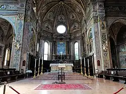 In the first chapel on the left it is possible to admire the youthful frescoes by the painter Bernardino Lanzani.[9] The frescoes narrate episodes from the life of Saint Majolus of Cluny. The fourth chapel on the left is dedicated to the life of Saint Anthony the Great. The frescoes are from Lanzani's workshop and describe episodes from the contemplative life of Saint Anthony. At the back of the church, on the right side of the main altar, the chapel dedicated to San Martin of Tours is preserved. It is a chapel with large volumes typical of the Gothic, with beautiful frescoes also by Bernardo Lanzani. On the dome, which is divided into eight segments, the celestial vault is painted, small clouds and heads of cherubs with purple wings forming concentric circles. The keystone is dominated by the great dove of the Holy Spirit, which hovers in the sky with outstretched wings, emphasized by the rays of golden light. The presbytery contains a rich frescoed decoration dating back to the early 1500s, again by Bernardino Lanzani.[10]