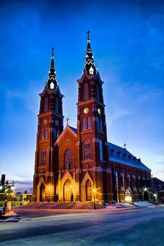 The basilica features Ruskinian Gothic Revival architecture.[3] The two steeples are 212 feet (65 m) tall with 14 feet (4.3 m) crosses that cap the spires.[2] This helps make the church visible from miles away across the rolling lightly forested farmland. Pilots often use these steeples as landmarks during flights. The church is a rectangular structure that measures 174.5 by 70 feet (53.2 by 21.3 m) and is 76 feet (23 m) high.[3] It has a polygonal apse on its west side. The interior includes columns and vaulted ceilings. The church has a seating capacity of about 1,000 people.[3] There are about 5,000 people total in the parish.[2]