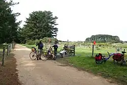 From Anderson to Kilcunda the trail drops 40 metres (130 ft) in height as it winds down through farming country. The rail trail at Kilcunda is built on the coastal sand dunes and incorporates a landmark trestle bridge over Bourne Creek. Path users have panoramic scenic views of the Bass Strait coast and the Wonthaggi Wind Farm that was erected during 2005.
