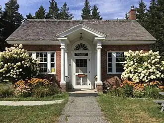The library building has two parts, a main block constructed of brick in 1922 and a rear extension framed in wood and built in 1991. The main block is laid in running bond above a row of soldier bricks laid on the concrete foundation, and is topped by a side gable roof. The main facade, facing east, has a central projecting gable-roofed portico supported by modified Doric pilasters and columns. The main wall under the portico, surrounding the entrance, is stuccoed. The wooden door is topped by a semicircular fanlight set in moulded trim. The rear wood-frame addition is more utilitarian, and is clad in vinyl siding.[2]