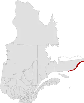 Basse-Côte-Nord Territory (French: Territoire de la Basse-Côte-Nord, pronounced [tɛʁitwaʁ də la bas kot nɔʁ], meaning "lower north shore") was a territory equivalent to a regional county municipality (TE) in eastern Quebec, Canada. The territory, whose geographical code was 982, was formed in 2002 when it separated from the Minganie Regional County Municipality and was superseded by Le Golfe-du-Saint-Laurent Regional County Municipality that was formed in July 2010.[1]