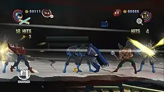 Batman: The Brave and The Bold – The Videogame is a side-scroller beat 'em up/platformer with 2D animated visuals based on those of the series.[1] Each level is presented as an episode and features Batman teaming up with one of several superheroes, including Hawkman, Robin, Green Lantern, Blue Beetle, and Plastic Man to stop various supervillains.[2] Players have access to several gadgets and can also summon another Jump-In Hero to perform a powerful attack.[3] As the enemies are defeated, coins can be collected. They can be used to upgrade Batman's gadgets, making them more powerful.[4]
