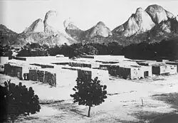 The ground at Agordat was a natural defensive position and the defences mostly blocked an advance from the south-west from Biscia and Barentu; the northern flank was barred by the bed of the Baraka river.[9] Two roads from Kassala ran to Agordat, a track to the north through Keru and Biscia, where the road improved and the Via Imperiale, a tarmac road through Tessenei, Aicota and Barentu. The roads joined at Agordat and went through Keren, the only route to Asmara. Agordat was a small town on the north bank of the Baraka river, a dry strand except in the rainy season, with palm groves along the banks. To the south-west of Agordat, was the Laquetat ridge, defended by a fort at each end, wire entanglements and a concrete wall. To the south-east, the Italians had built fortifications on four rocky outcrops and beyond was Mount Cochen, with a peak about 2,000 ft (610 m) above the plain.[15]