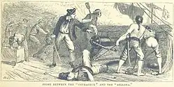 At 05:00 on the morning of 14 August, L'Ambert changed his opinion of the strength of the British squadron, assuming that Bellona was a 50-gun fourth rate ship. Confident of victory, he turned his squadron back towards Faulknor's ships, ordering Malicieuse and Hermine to attack Brilliant while he led Courageux against Bellona.[5] The ships of the line approached one another head on, L'Ambert pulling Courageux alongside Bellona at 06:25 and opening fire with his broadside at close range. Faulknor delayed his response until the second broadside, his crew firing two broadsides of their own in quick succession while he backed his sails, throwing Bellona into reverse and swinging alongside Courageux.[3] The French ship's gunnery was however more effective in the initial stages of the action, and Faulknor's mizzen-mast was brought crashing down nine minutes after the first gunfire.[6] When a crewman expressed dismay at this damage, Faulknor was reported to have responded "Confound you! you rascal, what has a two-decked ship to do with a mizzen-mast in the time of action. See and knock away his mizzen-mast."[3]