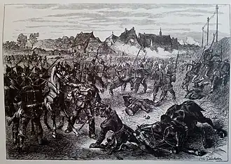 An investigation was initiated against a number of Hessian officers in connection with their behavior in the Frohnhofen field.[5] The Hessian general von Stockhausen shot himself after the military disaster in which his son was killed.[6] Lieutenant General Carl Freiherr Pergler von Perglas was recalled on August 11 as commander of the Hessian division, although this was officially done for health reasons.[7] However, the general was held responsible for the defeat at Frohnhofen because, contrary to the orders of the corps commander, he had ordered an attack and after this order was given he also left the battlefield.[8] The Hessian War Minister Friedrich von Wachter asked on 6 December 1866 to resign, which then led to his replacement.