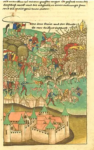 5. ^ Rudolf Wackernagel: Der Kampf mit Burgund. In: Geschichte der Stadt Basel. Band 2, Teil 1, 6. Buch, Verlag von Helbing & Lichtenhahn, Basel 1911, S. 77–78 (Volltext [Wikisource]).