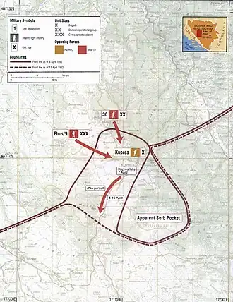 The Malovan-based battalion set up its first roadblock on 26 March, and the Kupres Battalion established its own checkpoints in response the following day.[15] On 27 March, an attempt to reach a negotiated settlement failed and the commanding officer of the 19th Partisan Brigade announced that armed combat might start at a moment's notice. The news prompted the evacuation of civilians of all ethnicities on 27–28 March.[16] According to the daily report of the 30th Partisan Division of 29 March, the Kupres Plateau was deserted except for able bodied and armed men. The same report noted that the JNA could not deploy to Kupres itself without a fight.[16] The JNA was convinced that the HV had intervened at Kupres to threaten the Bosnian Serbs.[17] Kupres had a high strategic value, because it sat astride a road linking the towns of Bugojno and Tomislavgrad from the central Bosnia region to western Herzegovina and further on to Croatia.[18]