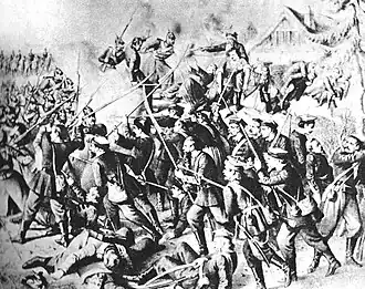 The Battle of Małogoszcz took place on 24 February 1863 near Małogoszcz in the Holy Cross voivodeship. It was the one of biggest battles of the January Uprising. Polish general Marian Langiewicz began concentrating his forces in the Holy Cross Mountains; he wanted to attack Warsaw with them, but the Russians unveiled his attempts. He was attacked by a few Russian forces simultaneously. Langiewicz defeated them all in many skirmishes. Polish forces grew to 2,600 men most of them peasants armed with scythes. Russian colonel Vladimir Dobrovolsky attacked near Małogoszcz. The Russians shelled Polish positions, but their attack was eventually smashed by a Polish cavalry counterattack. Langiewicz ordered a retreat. The battle was indecisive - the Russians failed to annihilate the Polish army and the Polish failed to defend their positions.