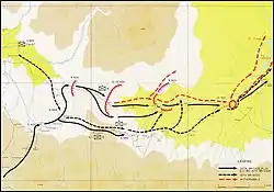 Several frontal assaults by the 16th Brigade, the lead Australian brigade, around Oivi were repulsed over several days with the Australians being subjected to heavy artillery fire,[13] until the Australian divisional commander, Vasey, decided to launch a flanking move towards Gorari, determining that in the circumstances he could afford to move the 25th Brigade forward from Kokoda, leaving it largely undefended.[18] After stockpiling stores, the attack was commenced.[11] Two battalions – the 2/2nd and 2/3rd Infantry Battalions, as well as the Militia 3rd Infantry Battalion – pinned the Japanese defenders in place around Oivi, while the 2/1st, detached from the 16th, carried out a flanking move with the three battalions of the 25th Brigade – the 2/25th, 2/31st and 2/33rd Infantry Battalions – which were sent on a wide flanking move around Gorari by way of Kobara and Komondo.[19][11][20]