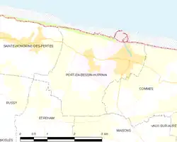 The port lay between Omaha and Gold beaches and was close to Blay, the site of a prospective command post for General B. L. Montgomery, the Allied Ground Forces Commander. British petrol and oil storage depots were also to be established near the port and for American forces at St. Honorine 2 miles (3.2 km) west, under the code-name Tombola, to be filled from tankers offshore, using buoyed pipelines. The first pipeline into Port-en-Bessin opened on 25 June.[1]