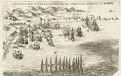 Around noon, the flagship of the Spanish admiral, Don Diego de Egues, caught fire; shortly afterwards she was destroyed when her powder magazine exploded. English sailors took to boats to board Spanish ships and set them on fire. By 3:00 pm, all sixteen Spanish ships in the harbour were sunk, ablaze or had surrendered. According to other reports, twelve Spanish merchants survived the attack.[19] Contrary to orders, Swiftsure and four other frigates each took a surrendered ship as a prize and attempted to tow them out of the harbour. Blake sent peremptory orders that the prizes were to be burnt. He had to repeat his order three times before the reluctant captains obeyed.[10][20]