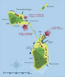 At 12:00 on 7 August, Gavutu was assaulted by the U.S. Marine 1st Parachute Battalion consisting of 397 men. The assault was scheduled for noon because there were not enough aircraft to provide air cover for the Guadalcanal, Tulagi, and Gavutu landings at the same time.[35] The preceding naval bombardment had damaged the seaplane ramp, forcing the naval landing craft to land the Marines in a more exposed location on a nearby small beach and dock at 9°6′53″S 160°11′19″E / 9.11472°S 160.18861°E. Japanese machine gun fire began inflicting heavy casualties, killing or wounding one in ten of the landing Marines as they scrambled inland in an attempt to get out of the crossfire coming from the two islets.[36]