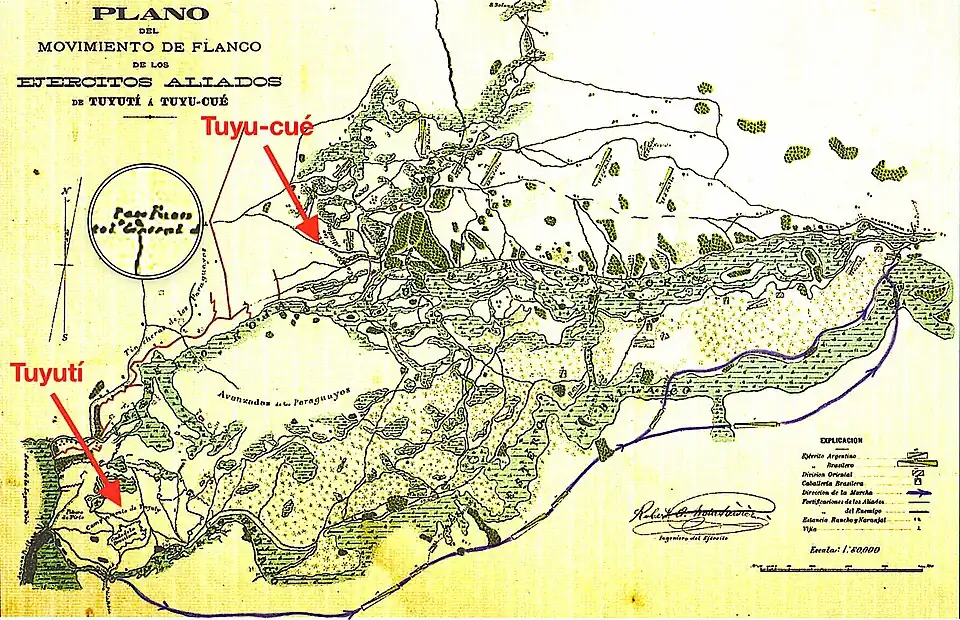 A map showing the distance between the allied camp at Tuyutí and the further inland Tuyú Cué, 13 kilometers.[7] The Paraguay river is at the map's bottom left.