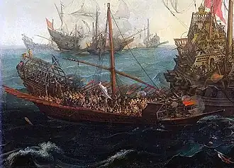 Increasingly punished, Rabazin on against the encircling Bazán on the hope of ramming his way out of the gulf, but the Christian galleys surrounded him and overwhelmed his flagship with artillery fire, killing 100 of his 300-men crew.[1] After six hours of battle, the Tunisian ships ran aground in the coast, where the enemy gunfire had pushed them while targeting their rigging and vulnerable sterns to leave them adrift. The crews started evacuating them against the orders of Rabazin, who urged them to stand firm and threatened them.[8] Meanwhile, Bazán boarded the immobile ships with his galleys and launched skiffs and feluccas to capture the escapees on the beaches.[9] During the boarding, Rabazin was captured by the knights of St. John after a duel against Spanish captain Diego Duque de Estrada, who got his rondache broken but capitalized on the range of his rapier to wound Rabazin in the head.[10] The Christian crews overcome all the ships.[10]