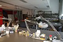 The museum includes a theatre and 20,000 square feet (1,900 square metres) of collections and exhibit space.[8] It is entered through the Mowafaghian Atrium, a glass-walled gallery two storeys tall which, in addition to the museum's gift shop and the Niche Cafe, houses the museum's signature piece: Canada's largest blue whale skeleton.[5] The display is a "see-through box" whose façade windows have "steel mesh brises-soleils". The museum lies parallel to one of the main walking routes of the university campus, was described in Exploring Vancouver: the architectural guide as "a perfect commission for architects known for creative restraint".[6] The whale is suspended over a descending ramp by which the collections are accessed.[6] The space also includes a "family zone" with juvenile reading materials and a teaching collection in a Discovery Lab.[9] Most of the collections are displayed in cabinet windows and shadow boxes, although a few are shown through alternative displays like in-ground "excavations" that under glass that visitors can walk on.[10]