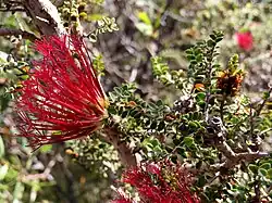 The flowers are usually red to dark purplish red but other colours and white flowers are sometimes seen. They are arranged in heads about 20 millimetres (0.8 in) in diameter, on the ends of branches which continue to grow after flowering. The flowers have 5 sepals, 5 petals and 5 bundles of stamens. Each bundle contains 4 to 7 stamens joined for about 3–4 millimetres (0.1–0.2 in) long of their length with the free parts a further 4–6 millimetres (0.2–0.2 in) long. Flowering occurs from June to January but mostly from October to December and is followed by fruits which are woody, almost spherical capsules 8–10 millimetres (0.3–0.4 in) in diameter.[2][3][4]