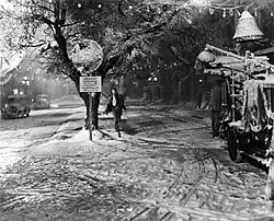 The film was shot at RKO Radio Pictures Studio in Culver City, California, and the 89 acre RKO movie ranch in Encino,[15] where "Bedford Falls" consisted of Art Director Max Ree's Oscar-winning sets originally designed for the 1931 epic film Cimarron that covered four acres (1.6 ha), assembled from three separate parts, with a main street stretching 300 yards (three city blocks), with 75 stores and buildings, and a residential neighborhood.[16] Capra built a working bank set, added a tree-lined center parkway, and planted 20 full grown oak trees to existing sets for It's a Wonderful Life.[17]