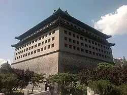 The Southeast Corner Tower was built from 1436 to 1439 and is a major state-protected historical site.[1] The tower, which rises 29 m (95 ft) in height with 144 archery windows, is the largest corner tower still standing in China.[8] The tower could house 200 soldiers and has ramps for soldiers and horses.[8] During the Qing Dynasty, bannerman of the Plain Blue Banner were stationed at the corner tower.[9] During the Boxer Rebellion of 1900, the tower was attacked and captured by the Eight-Nation Alliance.[8] It was known by Westerners as the Fox Tower.[10] Graffiti carved by the invaders are preserved inside the tower. The corner tower was restored in 1983 and became a tourist site. Inside the tower is an exhibit on the history of the city's Ming-era walls. The Red Gate Gallery, a privately managed, non-profit contemporary art gallery opened in 1991 inside the tower and operated for over two decades before moving to the 798 Art Zone.[8] In 2003, the Southeast Corner Tower became part of the Ming City Wall Relics Park.