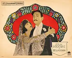 Bella Donna is a 1923 American silent film produced by Famous Players–Lasky and released by Paramount Pictures. The film is based on the 1909 novel, Bella Donna, by Robert Smythe Hichens which was later adapted for a 1912 Broadway play starring Alla Nazimova. This film is also a remake of the 1915 Paramount film Bella Donna starring Pauline Frederick. The 1923 film was directed by George Fitzmaurice and starred Pola Negri in her first American film.[1][2]