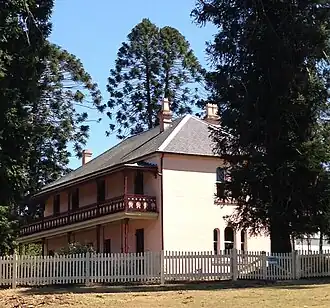 The main residence is a two-storey Victorian brick structure rendered throughout with stone-struck cement. The pitched roof is now terracotta tiles, with single chimneys on north and south elevations and two on the west. Verandahs on north and south elevations are of concrete over sandstone, five iron columns on the south face and six on the north are by Fletcher & Son, Waverley. The south elevation also has an upper balcony with wooden floor, five iron columns (three intact) and ornamental late Victorian cast iron balustrade brackets and fringe. Original door on south elevation with fanlight, has two shuttered windows either side, with an extra door added to the east. This and the four French windows in the upper storey have shutters also. The two windows in the east wall are late Victorian in form - triple with arched head.[1]