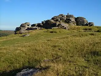 Bellever Tor is a granite tor in the centre of Dartmoor, England. It provides panoramic 360 degree views and is located near Bellever Forest and the popular village of Bellever. There are numerous Kists and Cairn Circles on its slopes.[1]