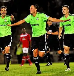 Ben Wright (centre) celebrates scoring for Forest Green Rovers in 2012–13