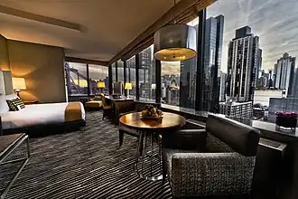The 21-story hotel, converted from an office building in 1998, has 197 rooms, as of 2010.[1] Many rooms offer views of the East River and Queensboro Bridge.[2][3] New York magazine's Nick Divito described the hotel as "a former high-rise office building that's been converted into a beacon of contemporary and surprisingly comfortable style. Think bright lights, boxy leather sofas and brushed-steel side tables."[4]
