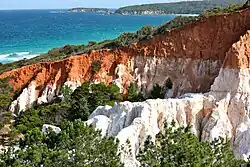 The park consists of two sections, on either side of Twofold Bay and the town of Eden. The smaller northern section is bounded on its western border by the Princes Highway. The geology of this section is mainly sedimentary rock (ironstone and clay) laid down in the Paleogene, with some quartzite outcrops. The main attraction for tourists is the Pinnacles, a multicoloured erosion gully with white sands overlaid by rusty red clay. The southern section coastline is metamorphic and Devonian in age, with some heavily folded sections at Red Point, near Boyd's tower.[14]