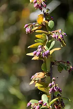Berberis holstii is a spiny evergreen shrub assigned to the barberry family, with simple leaves, hanging panicles with a few yellow flowers and eventually blackish-blue berries.[1] It is one out of only species of Berberis that grow in the wild in Africa, where it can be found at high altitudes (above 2000 m) in Tanzania, Uganda, Kenya, Ethiopia, Somalia, and Malawi. It is also reported from Yemen and Oman.[2][3] In Malawi it is known as Kayunga, while in Ethiopia it is called Gewo, Yeset af in Amharic, as well as Zinkila, a name also used in the Afar language, and Godxantool in the Somali language.[4][5][6]
