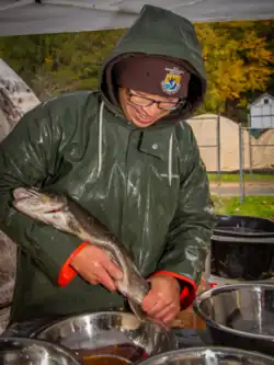 An employee spawns a lake trout (Salvelinus namaycush) at the hatchery.