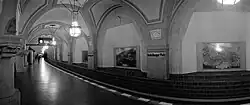 Since in the case of Heidelberger Platz U-Bahn station the tunnel section had to pass under the Ringbahn, which is in a very deep cutting (especially at this point), the profile was twice as deep as when building other U-Bahn stations. This special low location enabled the responsible architect, Wilhelm Leitgebel, to design a station that resembles a cathedral: the ceiling of the platform was designed as a groin vault, so that with its hanging light candelabras it gives the station a grandiose spatial effect (the station has been occasionally compared in literature to the magnificent stations of the Moscow Metro from the 1930s). The impression is further enhanced by the curved position of the hall and the island platform, which is closed off at both ends by vestibules to which the exits connect. All cladding is made of stone and some of it is made of tiles.