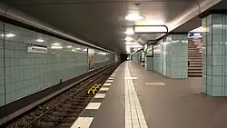 In 1940, the unfinished station was used as an air raid shelter; because it is located under the S-Bahn cutting, it is unusually deep underground.[9] There are still signs on the wall from this period. After the construction of the Berlin wall in 1961, the West Berlin Senate did not pursue the plans for an extension, since West Berliners were boycotting the GDR-run S-Bahn and there was thus no longer demand for a transfer point between the U-Bahn and it. Berlin Transport laid rails in the tunnel and used it to store disused trains.[7]