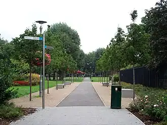 The park is bordered by Spa Road to the north, Grange Road to the west, and Alscot Road to the east and south, with Keyse Road running to the south-west. On the Spa Road side is the former Bermondsey public library, a Grade II listed Victorian red-brick building from 1890, which has recently been restored. It is now home to the Kagyu Samye Dzong Tibetan Buddhist Centre. On the corner of Spa Road and Alscot Road is the former Bermondsey Town Hall. On the Grange Road side is the Art Deco former Alaska fur factory, built by Wallis, Gilbert and Partners in 1932.[3] The Boucher Church of England Primary School's playground is on the site of St Luke's Bermondsey, which was bombed in WW2 and demolished in the 1960s.[4]