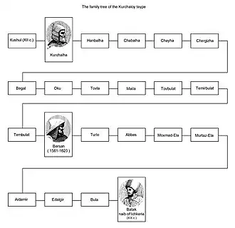 Genealogical tree of the Kurchaloyans from Nashkh came Kushul. Kushul — Kurchalha (12th century) — Khanbilha — Chabalkha — Chaykha — Chergishkha — Begal — Oku — Tovla — Maila (Maig) — Tovbolat — Tembolat — Timirbolat — Bersa (the first preacher of Islam — 1561.) — Turlo — Abbas — Mokhmad-ela — Murtaz-ela — Aidamir — Edalgir — Bulun Botakh (naib in Ichkeria — 1858).[3][4]